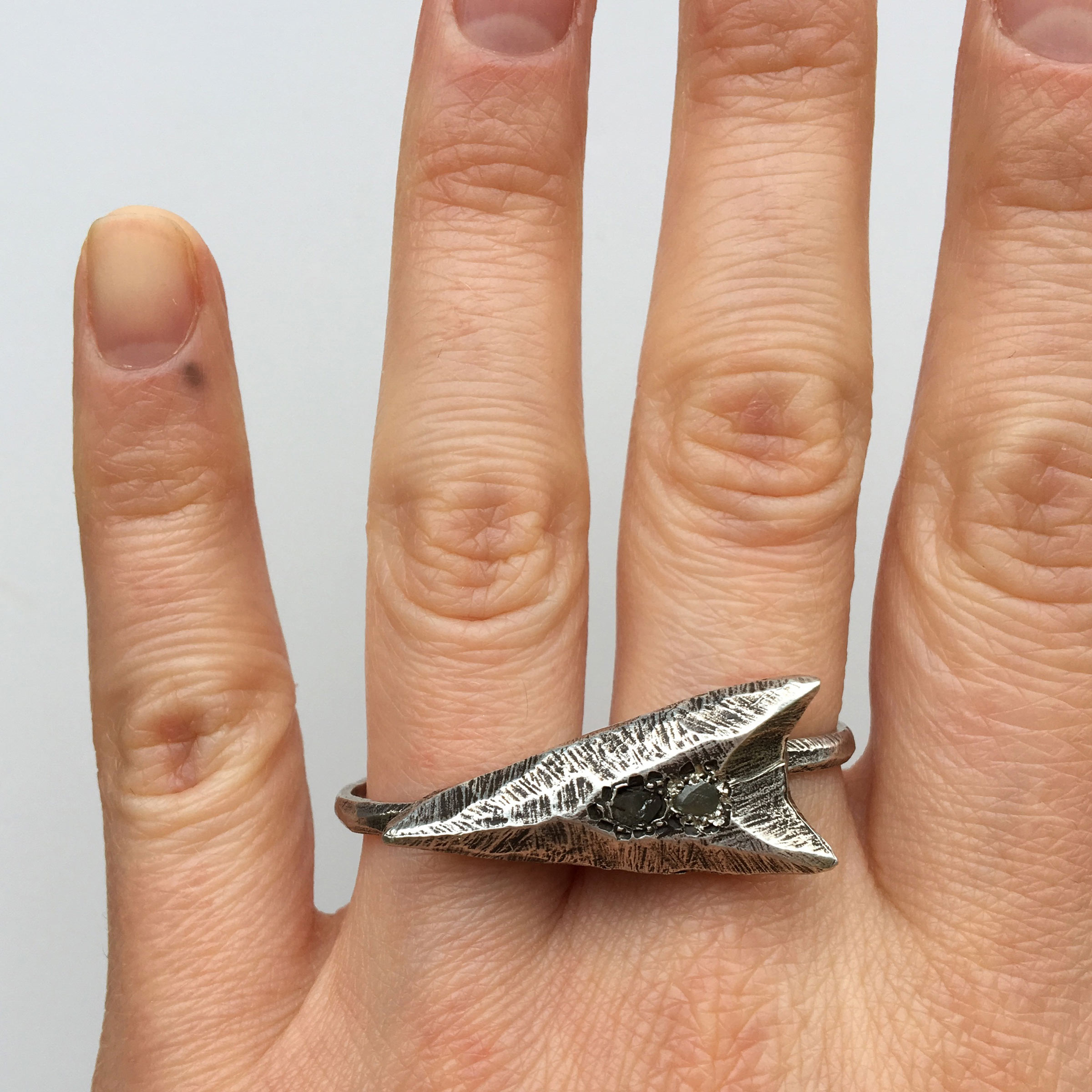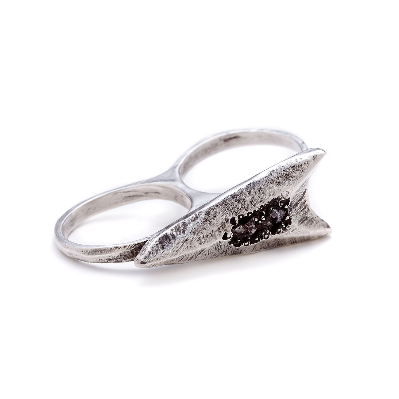 This blackened sterling silver two finger arrowhead ring is set with two rough diamonds. Ring sizes are 6 and 6.75 for the two fingers. Handcrafted by Elisa.