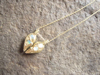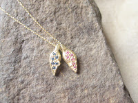 The pendants are available in 18 karat gold or sterling silver and strung on a simple, delicate chain. The silver pendant is set with white opals on the front and back, and the gold pendant is set in either opals or sapphires (also on the front and back of each piece). I wear a cluster of all 4 pendants on my neck, but they are a unique little shape worn alone or in pairs! I hope you have a lovely day!