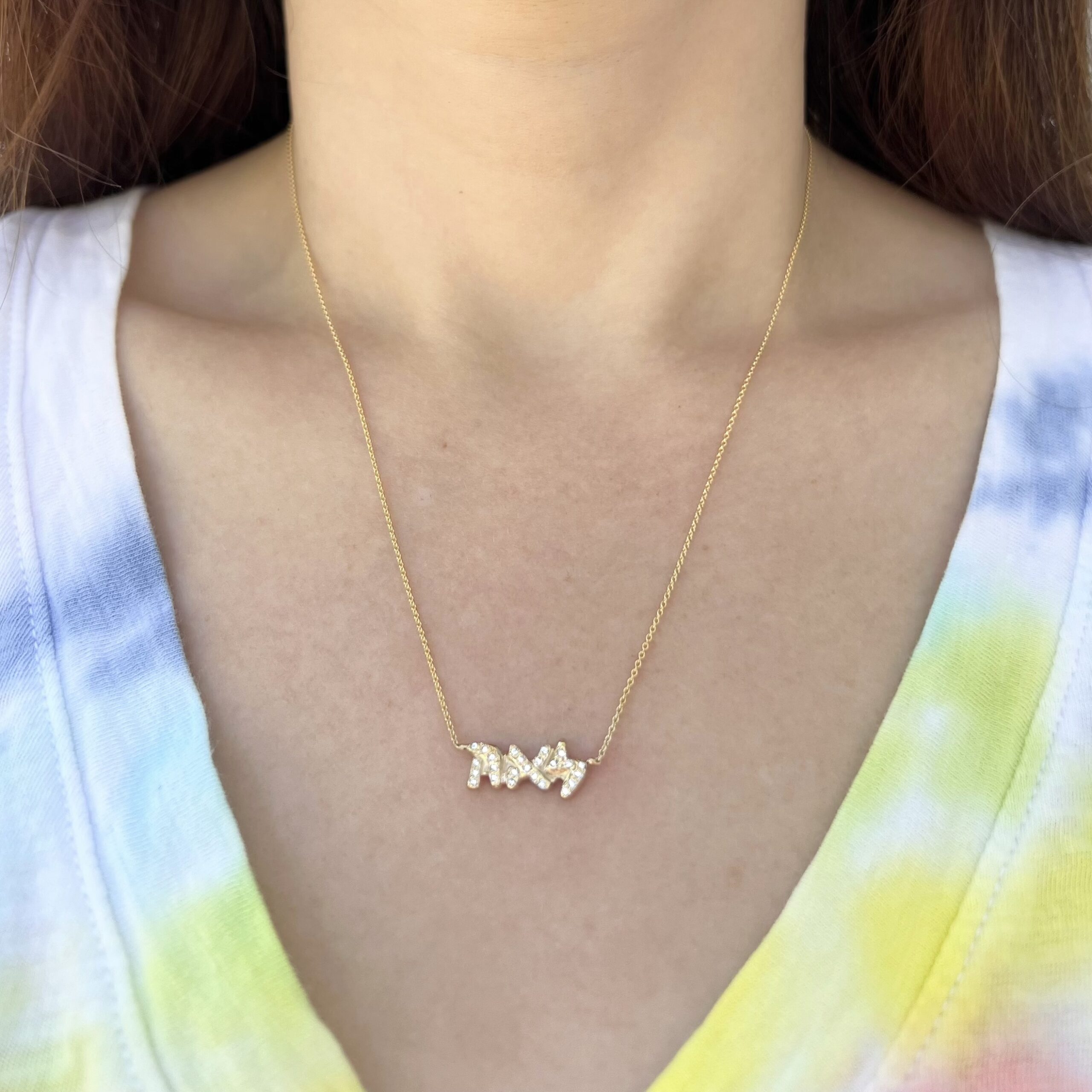 The name pieces are some of my favorites in my collection because they are incredibly special. Each is a one of a kind piece carved by me by hand. When I started carving names in Hebrew lettering, I was so happy to have finally found a way to expand my “name” collection. My kids saw the first Hebrew name sample on my desk and were fascinated by the Hebrew letters. They asked how to spell their own names out in Hebrew. I realized these were the kinds of pieces they would keep for a lifetime and had to make one for each of my kids. I originally only made these necklaces set with white diamonds, but for my son, I thought classic gold with a simple polish was more “him.” I carved his Hebrew name, Asher, which means happy or blessed. I also carved a necklace for my daughter with her Hebrew name, Leah, which means “delicate.” I set my daughter’s necklace with white diamonds as we love the sparkle!