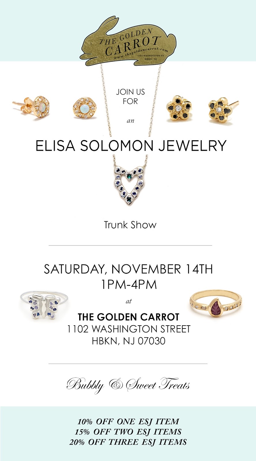 I am so thrilled to announce that The Golden Carrot in Hoboken, New Jersey will host an Elisa Solomon Jewelry TRUNK SHOW on November 14!!! Come by between 1-4pm to meet me and see a large, special selection of my 18 karat gold and sterling silver jewelry! I love this store and I can’t wait to visit with customers, talk about jewelry, and enjoy bubbly and sweets! We will also offer a lovely discount of 10 percent off one piece, 15 percent off two pieces, and 20 percent off three pieces!